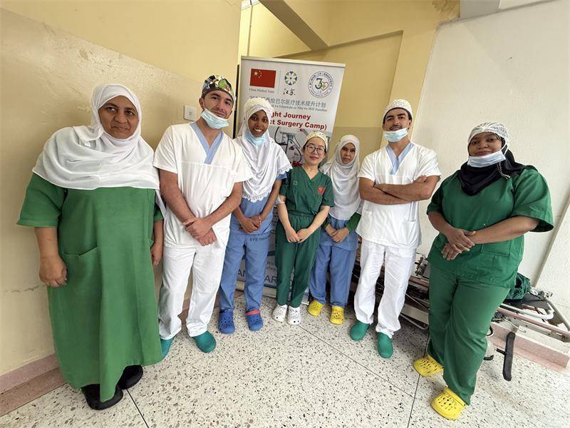 周石医生(中)与当地手术团队合影。中国援桑医疗队供图